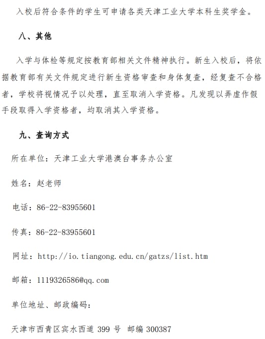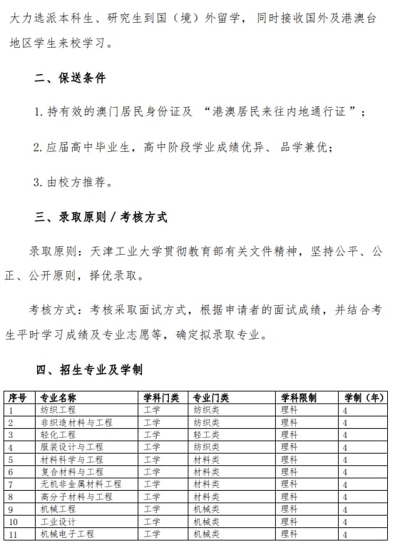 天津工业大学2024年澳门保送生招生简章